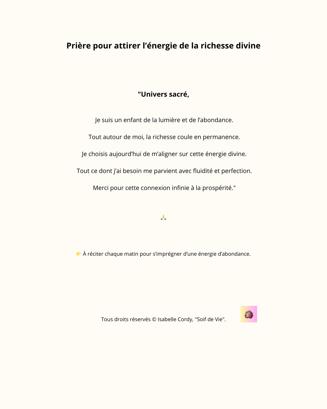 Prenez un moment pour lire ce message chaque matin ou chaque fois que vous ressentez le besoin de vous reconnecter à votre potentiel d'abondance. Vous pouvez également l'écrire dans un carnet ou (téléchargement du fichier ci-dessous),le réciter à haute voix pour renforcer son impact. Que l'abondance positive vous accompagne à chaque étape de votre parcours 🙏❤️!