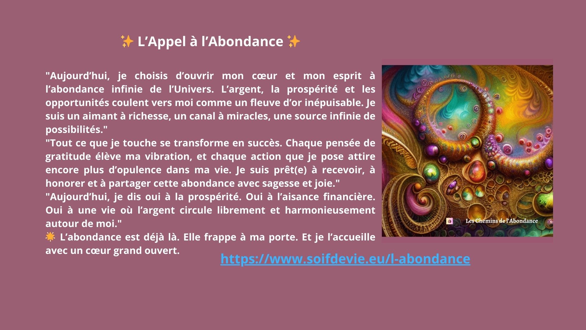 🔑 N’oublie pas : l’abondance commence dans l’esprit avant de se manifester dans la matière. Crois en elle, fais-lui de la place, et regarde-la entrer doucement dans ta vie.